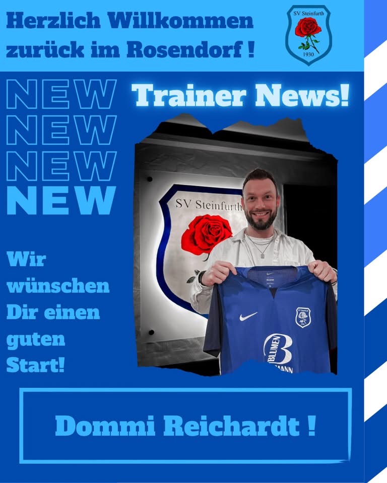 Willkommen zurück, Dominik!Der SV Steinfurth freut sich bekannt geben zu können, dass Dominik Reichardt ab Sommer 2026 die Position des Cheftrainers der 1. Mannschaft übernehmen wird! 🔥Dominik bringt als lizenzierter Trainer jede Menge Erfahrung mit: u.a. hat Dominik sieben Jahre als Trainer im Nachwuchsleistungszentrum von Eintracht Frankfurt sowie zuletzt an der Seitenlinie der Verbands- und Gruppenligamannschaft des SKV Beienheim gearbeitet. Er steht für klare Ideen, eine moderne und anspruchsvolle Trainingsarbeit und die kontinuierliche Weiterentwicklung einer Mannschaft 💪⚽Besonders schön für uns: Dominik ist bei uns alles andere als ein Unbekannter. Acht Jahre lang hat er selbst das Trikot (u.a. als Kapitän) unseres Vereins getragen und kennt den Verein, das Umfeld und die Menschen hier bestens.Jetzt kehrt er zurück – diesmal in neuer Rolle an der Seitenlinie.Wir sind überzeugt, mit Dominik die richtige Entscheidung für den nächsten Schritt unseres Vereins getroffen zu haben und freuen uns riesig auf die gemeinsame Zukunft.Schön, dass du wieder da bist, Dominik! 💙🌹