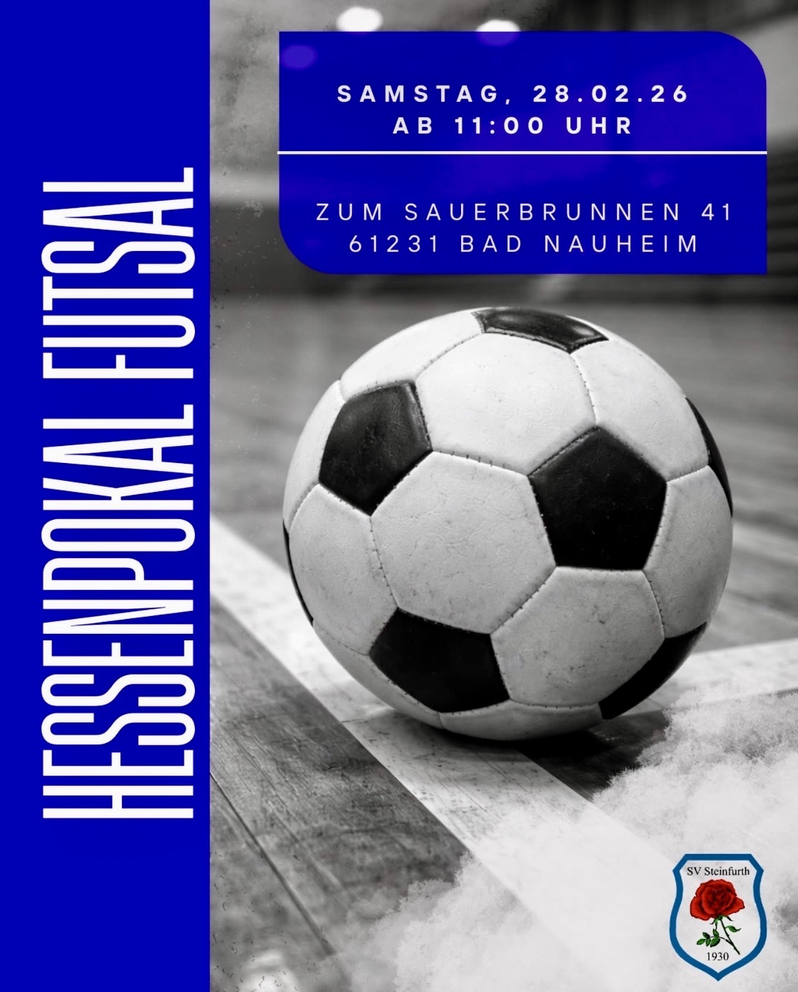 ALLE IN DIE HALLE!Der SV Steinfurth ist nicht nur Gastgeber, sondern auch als Hallenkreismeister selbst am Start und kämpft um den nächsten Titel. Jetzt brauchen wir EUCH auf der Tribüne! 🔥Kommt vorbei, sorgt für Stimmung und unterstützt uns bei diesem Heimturnier! Jede Stimme zählt! 🌹💙📅 Samstag, 28.02.2026🕚 Start: 11:00 Uhr📍 Zum Sauerbrunnen 41, 61231 Bad Nauheim